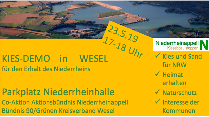 Wir vom Aktionsbündnis Niederrheinappell möchten vor allem auch diesen Behördenvertretern zeigen, welcher Unwillen gegen den überdimensionierten ungefesselten Kiesabbau besteht. Deshalb ist eine Demonstration für die Zeit von 17:00-18:00 Uhr vor der Niederrheinhalle angemeldet.