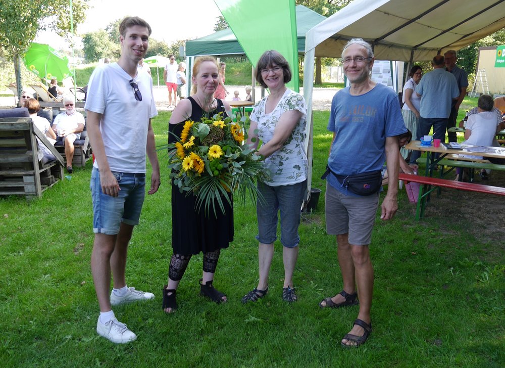 Als Vertreter*innen des Kreisverbandes überreichten Christina Lantwin und Hans-Peter Weiß einen Blumenstrauß an Mascha Gores und Jan Krüßman (Sprecher*innen des OV Voerde).