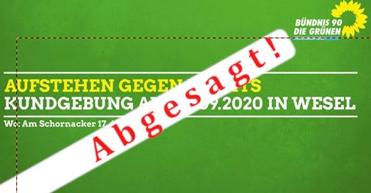 Die für den kommenden Sonntag, 6.9.2020 von 9 bis 10 Uhr Am Schornacker 17 in Wesel angekündigte Kundgebung gegen Rechtsextremismus und Fremdenhass wurde abgesagt, da der Anlass entfallen ist.
