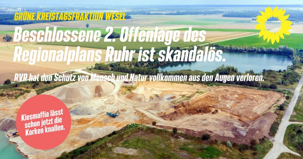 Letzte Woche Freitag hat die Verbandsversammlung des Regionalverbandes Ruhr mehrheitlich die 2. Offenlage des Regionalplanentwurfes beschlossen. Hauptstreitpunkt war dabei der Kiesabbau im Kreis Wesel. Hier werden Flächen von 1.200 ha zusätzlich ausgewiesen. Das sind umgerechnet rund 2.700 Fußballplätze.