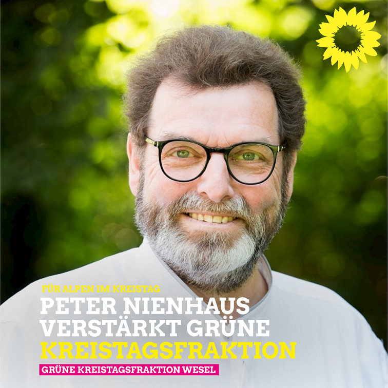 "Wir freuen uns, dass uns Peter Nienhaus nun auch als Kreistagsmitglied mit seiner langjährigen kommunalpolitischen Erfahrung tatkräftig unterstützen wird“, so Fraktionsvorsitzender Hubert Kück. Nienhaus ist ordentliches Mitglied im Ausschuss für Schule, Kultur, Sport und Integration und stellvertretendes Mitglied in den Ausschüssen für Soziales und Arbeit, Kinder und Jugendhilfe sowie Wirtschaft, Beteiligungen und Regionalentwicklung. Nienhaus selbst bezeichnet sich als „grünes Mitglied der ersten Stunde“ und weist auf seine 41-jährige Parteimitgliedschaft hin. Hier war er zunächst im Kreisvorstand in verschiedenen Funktionen aktiv. 1994 gehörte er zu den Gründungsmitgliedern des Ortsverbands Alpen und ist dort seit 18 Jahren Parteisprecher. Außerdem gehört er seit 18 Jahren dem Gemeinderat an. Dort ist er auch seit 12 Jahren Fraktionssprecher. Aktuell ist er auch 2. stellvertretender Bürgermeister in Alpen. „Politisch mache ich mich für die regionale Vermarktung und die Entwicklung des ländlichen Raums stark. Gerade die bäuerliche und ökologische Landwirtschaft unterstütze ich, die unseren Kreis mit seiner niederrheinischen Kulturlandschaft stark prägt. Natürlich möchte ich auch als Bindeglied zwischen der Gemeinde Alpen und dem Kreis Wesel fungieren“, so Nienhaus. Der begeisterte Radfahrer und Karnevalist engagiert sich auch als Bürgerbusfahrer, Schülerlotse und als Fahrer für die Tafel. „Als Christ liegt mir auch der gesellschaftliche und soziale Zusammenhalt sehr am Herzen“, so das neue Kreistagsmitglied abschließend.