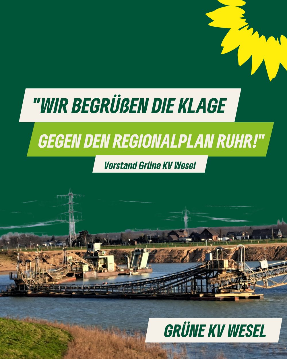 Der Vorstand von Bündnis 90/Die Grünen im Kreis Wesel begrüßt ausdrücklich die Klage von fünf Kommunen im Kreis Wesel sowie des Kreises selbst gegen den jetzt in Kraft gesetzten Regionalplan. Dieser sieht neue Auskiesungsflächen von über 900 Hektar (zusätzlich zu den bereits jetzt ausgekiesten ca. 6.000 Hektar) im Kreis Wesel vor.