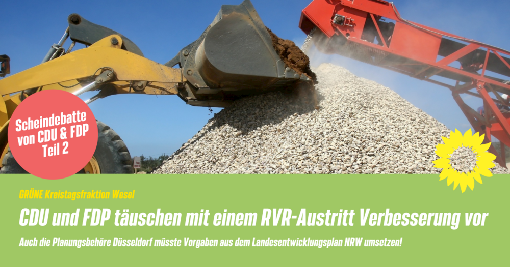 Wenn Vertreter*innen von CDU und FDP im Kreis Wesel behaupten, dass sich die Probleme beim hemmungslosen Raubbau durch die Kiesindustrie am Niederrhein dadurch lösen lassen, dass man den Regionalverband Ruhr verlassen soll, kennen sie entweder die Zusammenhänge nicht oder wollen den Betroffenen buchstäblich Sand in die Augen streuen, denn der RVR als Regionalplanungsbehörde für den Kreis Wesel ist wie jede andere untergeordnete Behörde verpflichtet, nach Recht und Gesetzt zu handeln.