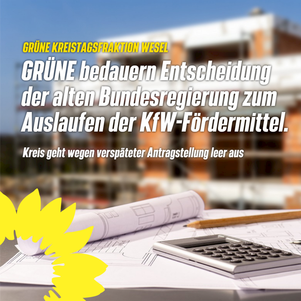 Die GRÜNE Kreistagsfraktion bedauert das vorläufige Auslaufen der Klimafördermittel im Bereich Bauen, sieht aber gleichzeitig Licht am Horizont für zukünftige Fördertöpfe. Dass das jetzige KfW-Förderprogramm auslaufe, sei bereits im November von der alten CDU/SPD-Bundesregierung für Ende Januar beschlossen worden.