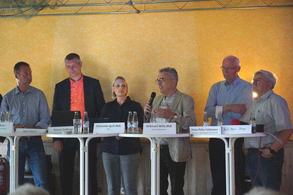 Neben Vertretern der HWS-Initiative, unseres lokalen Deichverbands Mehrum und der angrenzenden Deichverbände waren auch die lokalen Landtagsordneten der Regierungsfraktionen eingeladen. Charlotte Quik (CDU) und Volkhard Wille (Grüne) betonten, dass man die engagierte und verlässliche Arbeit der Deichverbände schätze. Es sei aber wichtig, staatliche Unterstützung zu leisten und bürokratische Belastungen abzubauen, sodass ehrenamtliche Strukturen nicht überfordert werden.