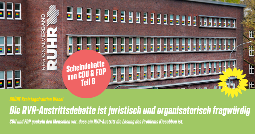 Das reale Austrittsdatum nach einem positiven Entscheid, das Auseinanderdividieren der Beteiligungen, die gesamten finanziellen Konsequenzen: All das wäre zunächst von den Verwaltungen in Essen und Wesel zu bearbeiten, darzustellen, zu bedenken und hat mit der jetzigen Diskussion um den Kies überhaupt nichts zu tun. Außerdem finden wir es rechtlich zumindest fragwürdig, im laufenden Verfahren bei der Erstellung des Regionalplans Ruhr die Zuständigkeit der Regionalplanungsbehörden zu wechseln.