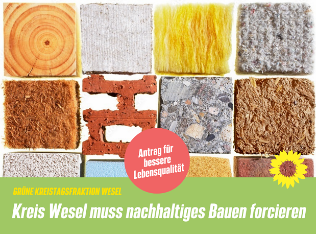 Nach dem Willen der GRÜNEN Kreistagsfraktion soll der Kreis Wesel als Bauherr zukünftig verstärkt darauf hinarbeiten, dass ausschließlich ökologisch, nachhaltig und nach Kriterien anerkannter Zertifizierungen gebaut wird. Als ersten Schritt müsse der Kreis bei eigenen Bauvorhaben, seiner Tochtergesellschaften und Beteiligungen immer den Einsatz von alternativen- und Naturbaustoffen, sowie verstärkt Recyclingmaterial vorsehen.