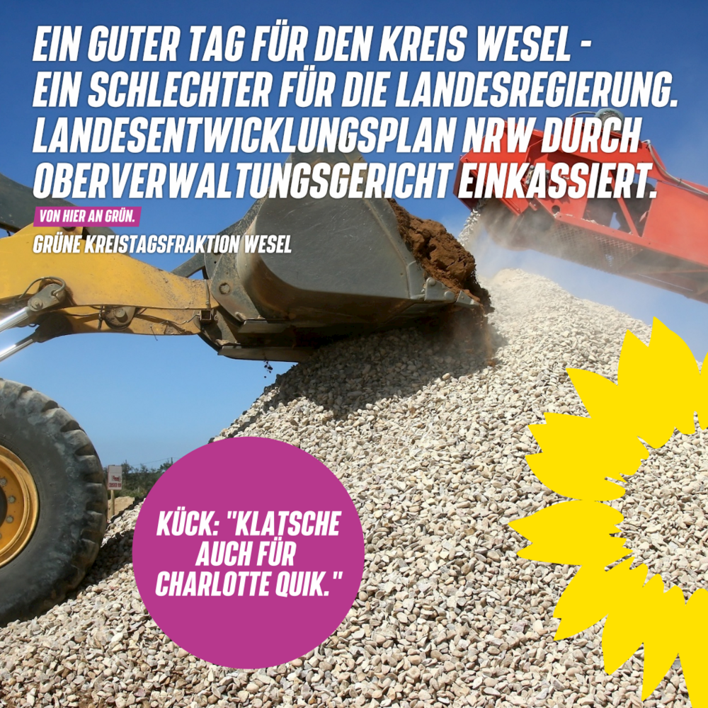 Die Entscheidung des Oberverwaltungsgerichts in Sachen Kiesabbau ist die „maximale Klatsche“ für die CDU-Landtagsabgeordnete Charlotte Quik und die regierungstragenden Fraktionen von CDU und FDP im Düsseldorfer Landtag. So kommentiert Hubert Kück, Fraktionsvorsitzender der Grünen im Kreistag Wesel das Urteil des Oberverwaltungsgerichts in Münster in Sachen Landesentwicklungsplan (LEP NRW). Quik hatte seinerzeit für den nun als rechtswidrigen eingestuften Plan gestimmt.