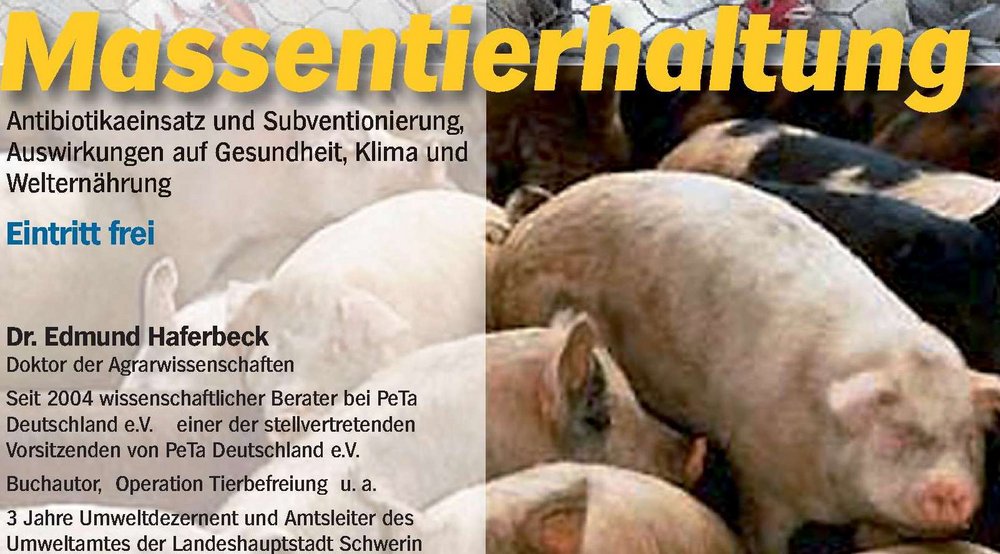 Bündnis 90/ Die Grünen in Rheinberg haben Dr. Edmund Haferbeck von der Tierschutzordanisation PetA eingeladen. Er referiert über das aktuelle Thema "Massentierhaltung". Dabei erläutert u. a. die Auswirkungen dieser tierfeindlichen Haltungsform auf unsere Gesundheit und das Weltklima.