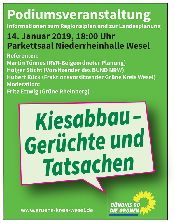 In der sehr gut besuchten Podiumsveranstaltung des Kreisverbands Wesel von Bündnis 90/Die Grünen war Hubert Kück, Fraktionsvorsitzender der GRÜNEN Fraktion im Kreistag Wesel, neben Martin Tönnes, (RVR-Beigeordneter Planung) und Christian Chwallek (Mitglied im Landesvorstand des NABU NRW) einer der Referenten, der zum Regionalplan, zur Landesplanung und zum Kiesabbau am Niederrhein ausführte.