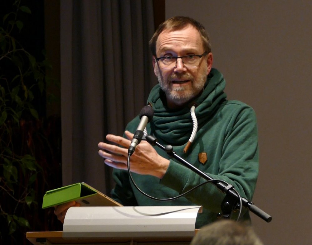 Kück informierte das Publikum im randvoll gefüllten Saal über den ruinösen Kiesabbau, über die schwerwiegenden Folgen für Mensch und Natur und über die eklatanten Interessengegensätze zwischen der Kiesindustrie und den Menschen am Niederrhein. Und er zeigte mögliche Wege aus dem Teufelskreis Kiesabgrabung auf und nannte deutliche Forderungen an Politik und Verwaltung.