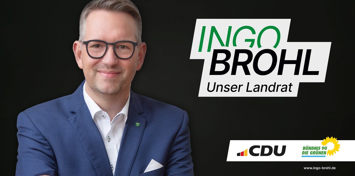 Der amtierende Landrat Ingo Brohl trittt als gemeinsamer Kandidat von Grünen und CDU für das Amt des Landrats zur Wahl am 14.09. an. Diese gemeinsame Kandidatur unterstreicht die enge Zusammenarbeit im Kampf für die Demokratie und das gemeinsame Ziel beider Parteien, die Zukunft des Kreises aktiv zu gestalten.